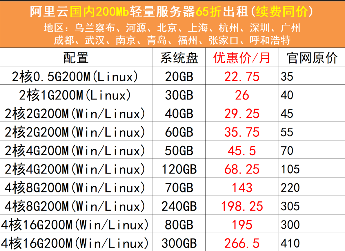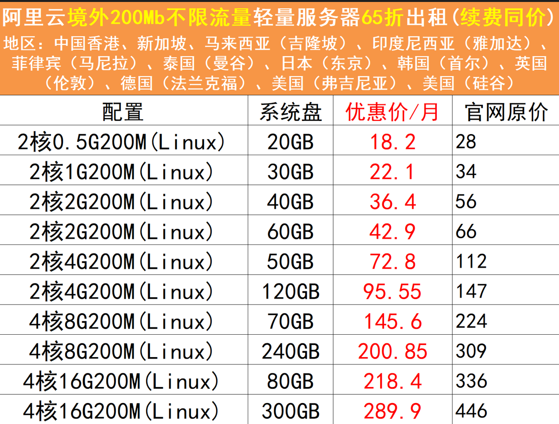 本站独家资源渠道,阿里云官方轻量云200m不限流量,境内境外机器6.5折起。